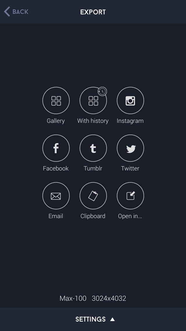 Para salvar a foto editada, toque o ícone Exportar (seta para cima no canto superior direito) e toque em Galeria para salvar a imagem no aplicativo Imagens nativas: