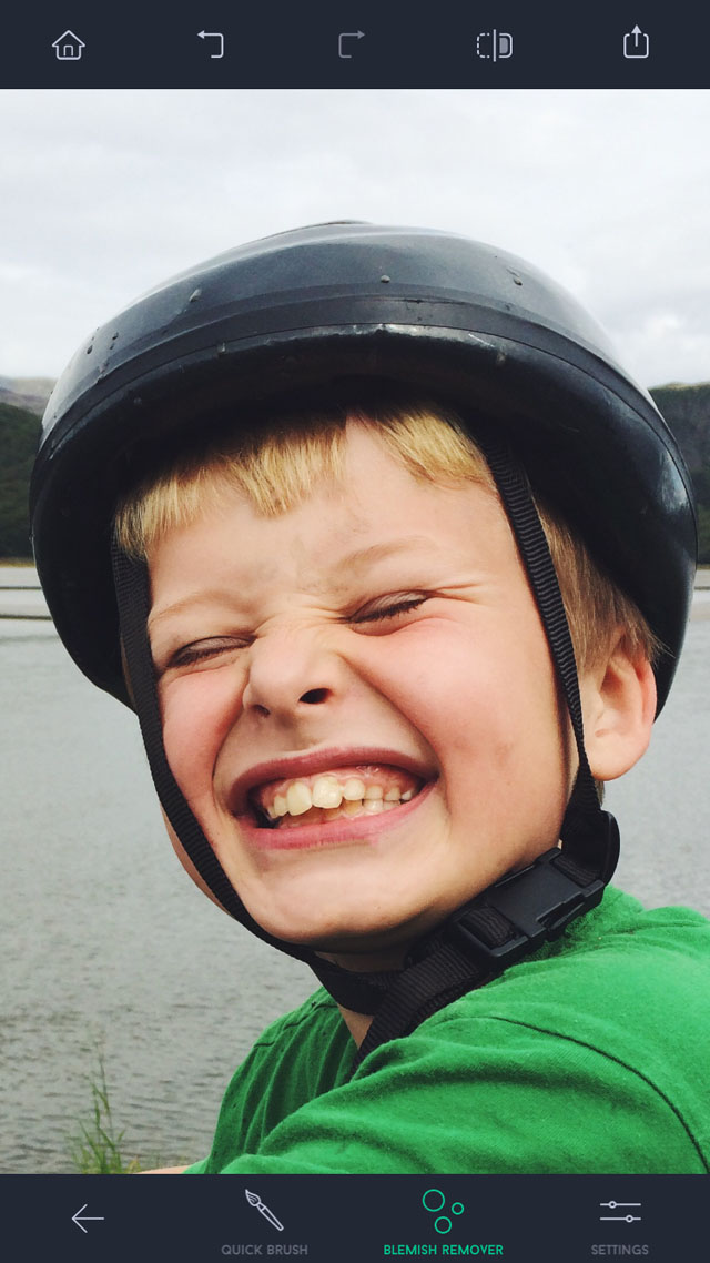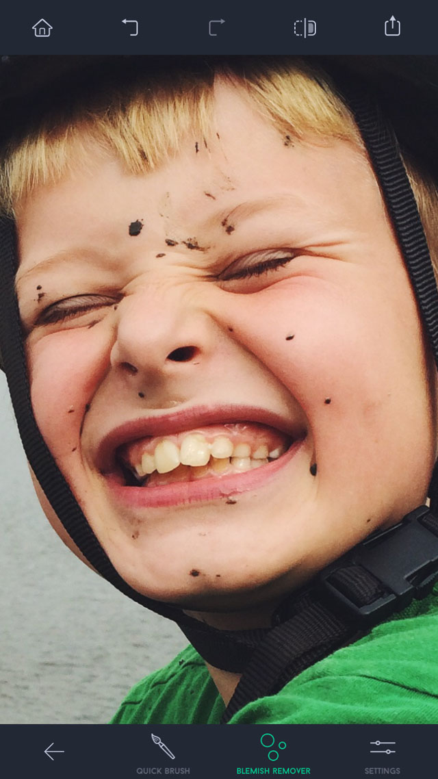 Se você estiver editando uma foto de retrato, o removedor de manchas é excelente para remoção rápida de pequenas manchas na pele. No exemplo abaixo, o menino tinha muitas manchas de lama no rosto: