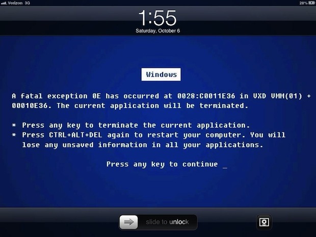 Tela azul fatal do Windows é um bloqueio de tela divertido para seu iPad