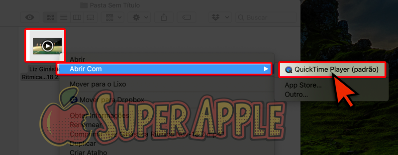 1. Abra o vídeo desejado com o QuickTime. Caso ele não seja seu player padrão, clique com os dois dedos e, no menu aberto, coloque o mouse sobre “Abrir Com” e selecione o QuickTime.