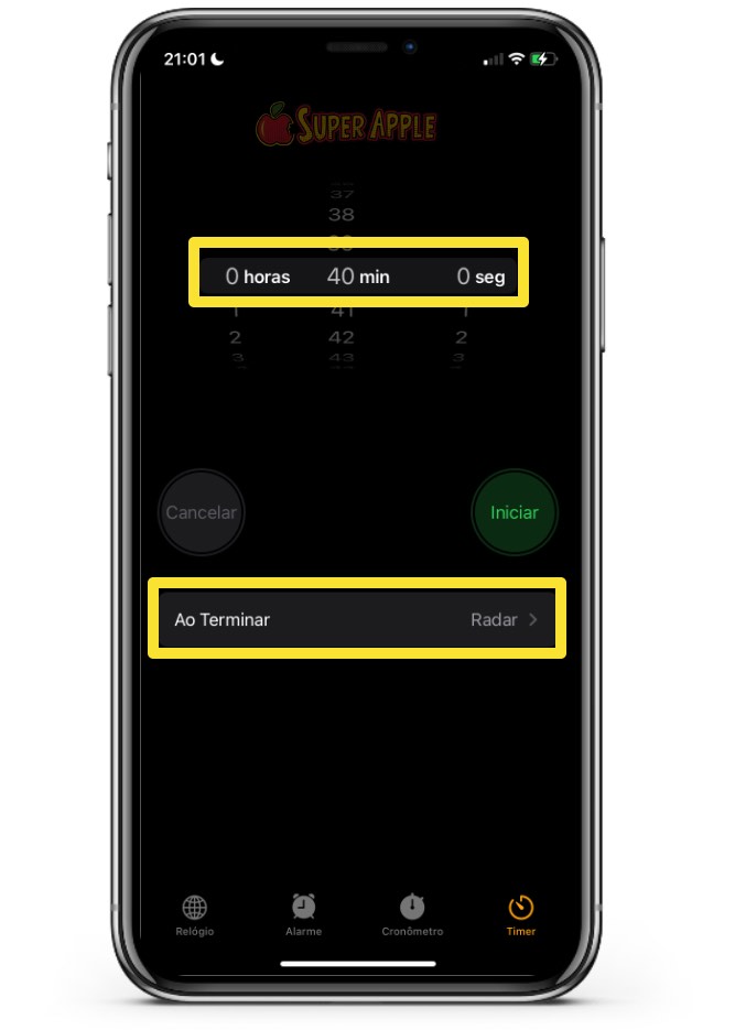 3. Agora selecione quanto tempo deseja que a música seja tocada. Em seguida toque no botão “Ao terminar”, localizado abaixo do tempo.