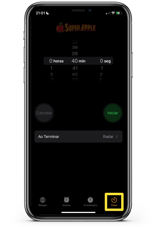 2. Em seguida, toque na aba Timer, localizada no canto inferior direito na tela do app.